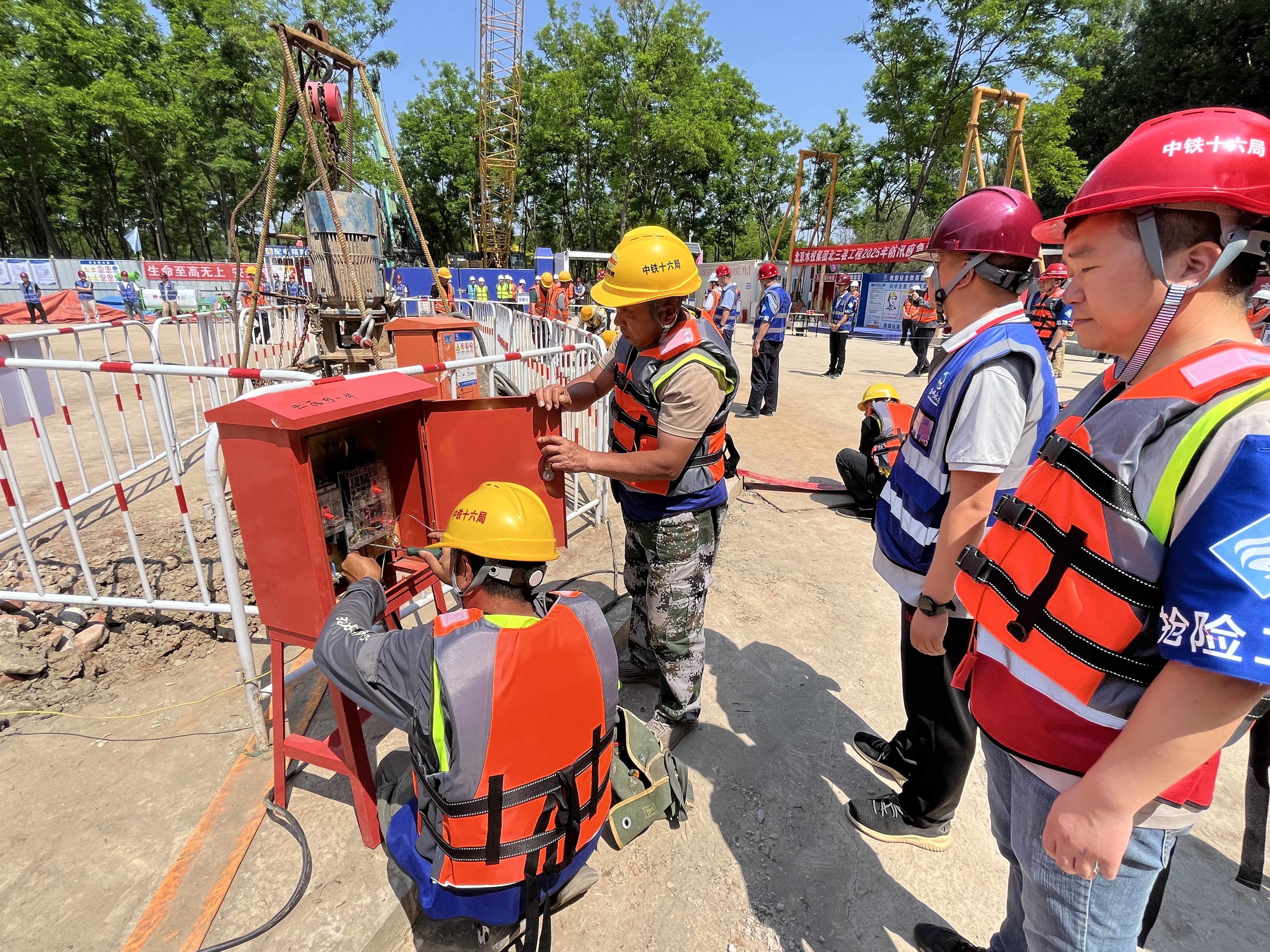 本次应急演练由集团“北三县”项目办牵头组织,,,,,各参建单位配合加入。。。。。。演练严酷凭证《“北三县”工程2025年防汛应急演练计划》执行。。。。。。演练中,,,,,总指挥史育斌现场指挥,,,,,副总指挥谢明利、现场指挥长白云庆有序安排,,,,,现场警戒组、抢险一组、抢险二组、后勤包管组、医疗救护组、通讯包管组、宣传组等各参建单位亲近配合、分工明确,,,,,顺遂完成竖井加高加固、井内抽水、警戒封控、后勤包管、应抢救治等使命。。。。。。整个抢险历程主要有序、有条不紊。。。。。。经由30分钟高效抢险,,,,,险情得以乐成控制,,,,,演练圆满完成。。。。。。